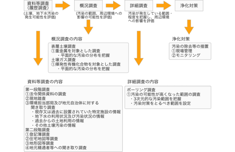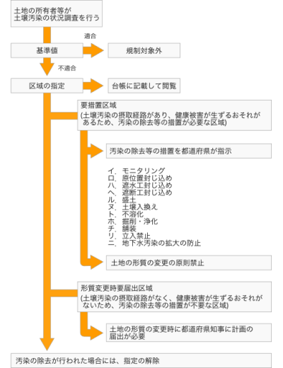 この法律によって、有害物質を取り扱っていた工場を廃止する場合や、工場跡地などの土壌汚染によって健康被害を及ぼす恐れのある場合や、一定規模以上の土地の形質の変更の届出の場合には、土地の所有者等がその汚染の状況を調査する事になる。
