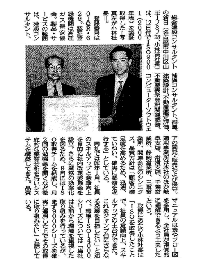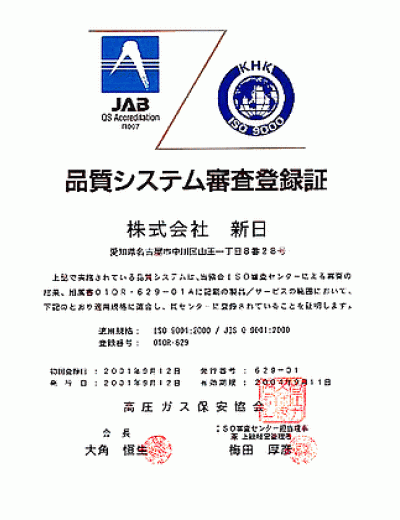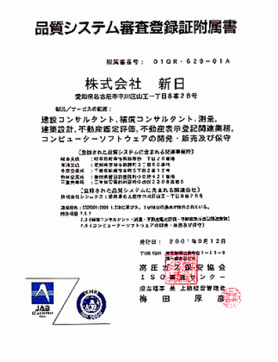 このたび当社は、昨年12月に改正された最新規格に対応する「ISO9001:2000」を9月12日付けで認証取得する事が出来ました。これもひとえに、関係各位の皆様の格別のご支援によるものと心より感謝いたしております。